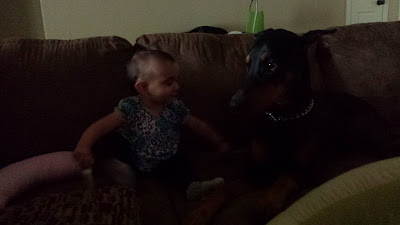 Today wore me out! We met up with Laura and her cutie Bailey and we adventured onto the base to go swimming at one of their outside pools. :) It was LOADS of fun! And although I didn't do any "real" swimming, it was still a total blast just holding Cam in the water and letting her do her lady-like splashing, and her idea of swimming lol. She had fun. WE all had fun. Although I could tell Camilla thought the whole experience was bemusing. She did really well, I was pretty shocked. She likes bath time, but she doesn't seem to be a total fishy in the water; I'm glad she got to experience the fun of the pool! And Laura and Bailey had lots of fun, too, in fact we're already planning on doing it again really soon before they close for the season lol. Yay! Then after the pool we went back to Laura's and random funny story: she had made a bottle for Bailey and Cam walked right over to Bailey who was innocently laying on the floor with it, and then Cam tried snatching it from her!! I was like CAM!! How rude!! Lol. She is such a silly girl.. Cam always tries to steal and take toys. And Bailey is so close to walking because she's always following Cam around... so funny. So adorable! They are cute together, though, and Cam is still pretty independent and into doing her own thing, but I've seen her gradually increase interacting and watching/looking at Bailey and Laura more, I mean, besides all the toy stealing. Lol.