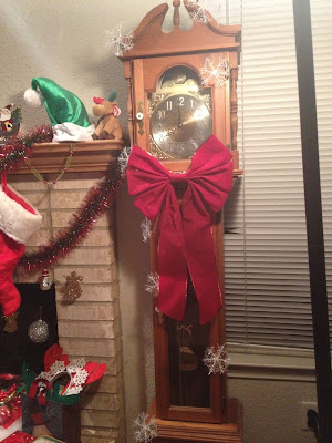 Even Mr. Grandfather clock is dressed up with a great big Holiday bow and brrrrrr, he's got snowflakes!